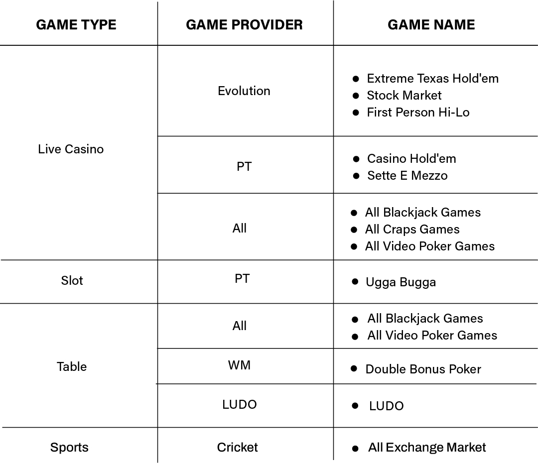 While most bets placed on our platform can be counted towards turnover calculation, and the bonuses we offer can be used on a wide range of games, there are some exceptions. For detailed information about the games and sport markets excluded from bonus wagering and turnover calculations, please refer to the table below: