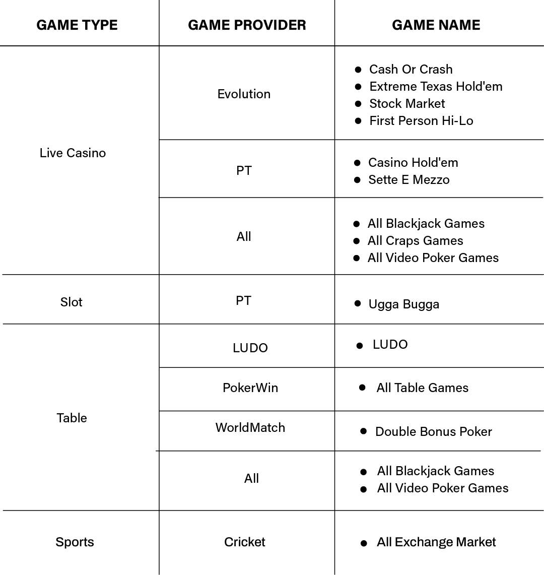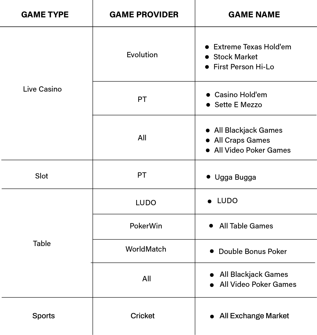 While most bets placed on our platform can be counted towards turnover calculation, and the bonuses we offer can be used on a wide range of games, there are some exceptions. For detailed information about the games and sport markets excluded from bonus wagering and turnover calculations, please refer to the table below: