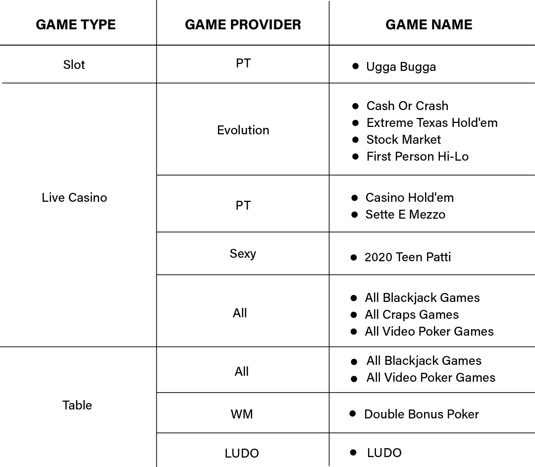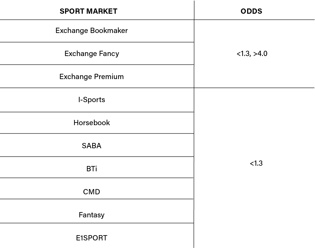 While most bets placed on our platform can be counted towards turnover calculation, and the bonuses we offer can be used on a wide range of games, there are some exceptions. For detailed information about the games and sport markets excluded from bonus wagering and turnover calculations, please refer to the table below: