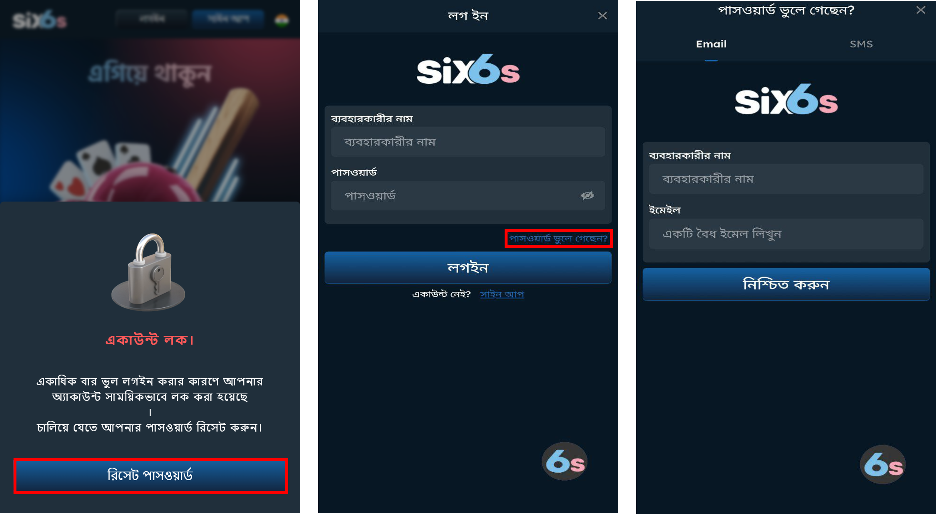 ধাপ ১: Six6s হোমপেজে ‘লগইন’ বাটনে ক্লিক করুন এবং ‘ফরগট পাসওয়ার্ড ” এ ক্লিক করুন।