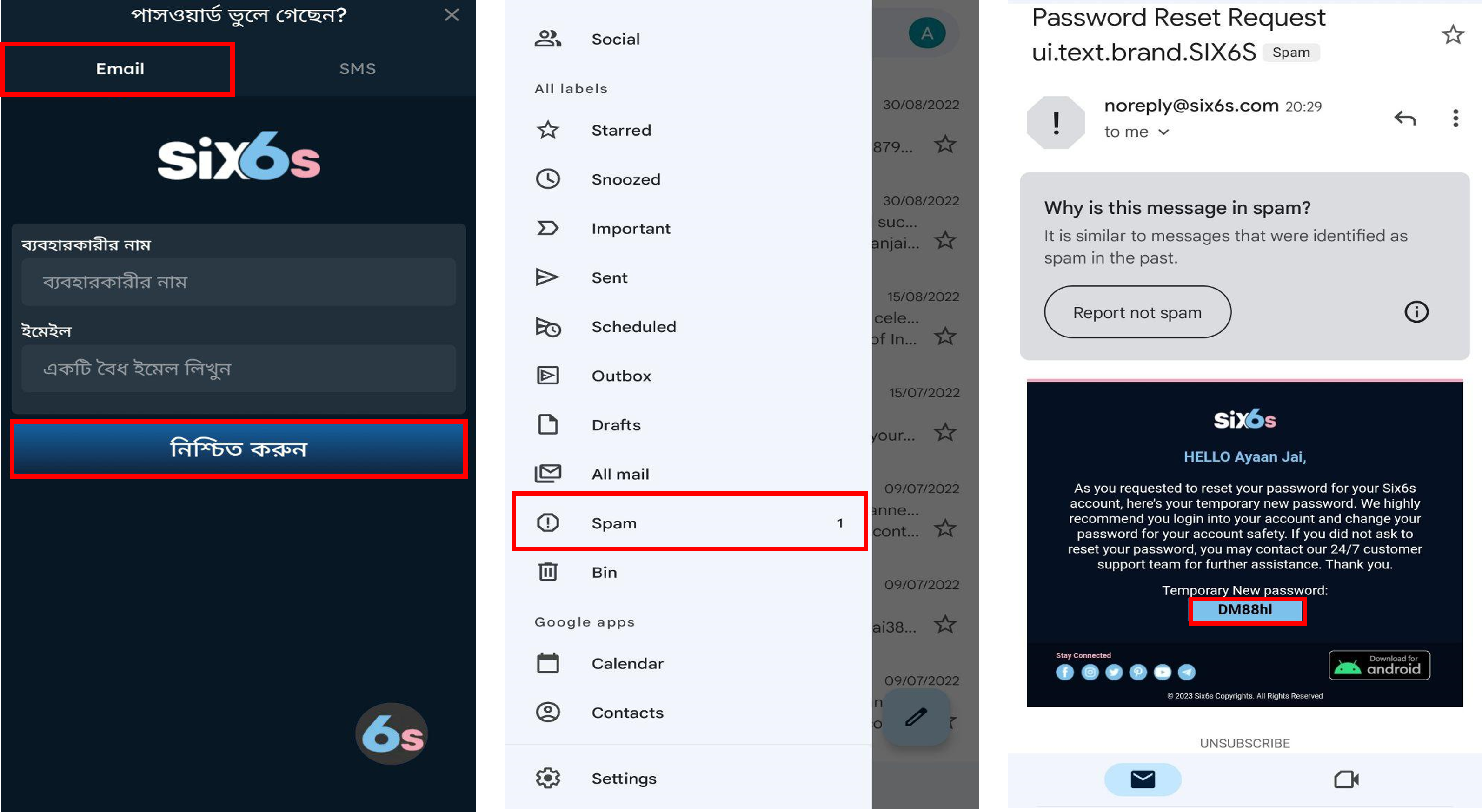 i) আপনি যদি ইমেইলের মাধ্যমে পাসওয়ার্ড রিসেট করতে চান তবে আপনার ইউজার নেম এবং Six6s অ্যাকাউন্ট এ রেজিস্টার কৃত ভেরিফাইড ইমেল অ্যাড্রেস টি বসান এবং “কনফার্ম” এ ক্লিক করুন। আপনার ইমেইল এ লগিন করুন এবং আপনার রেনডম পাসওয়ার্ডটি রিসিভ করেছেন কিনা চেক করুন যদি আপনার প্রাইমারির ইনবক্সে ইমেইলটি খুঁজে না পান তবে আপনার জাঙ্ক অথবা স্প্যাম ফোল্ডারটি চেক করুন।