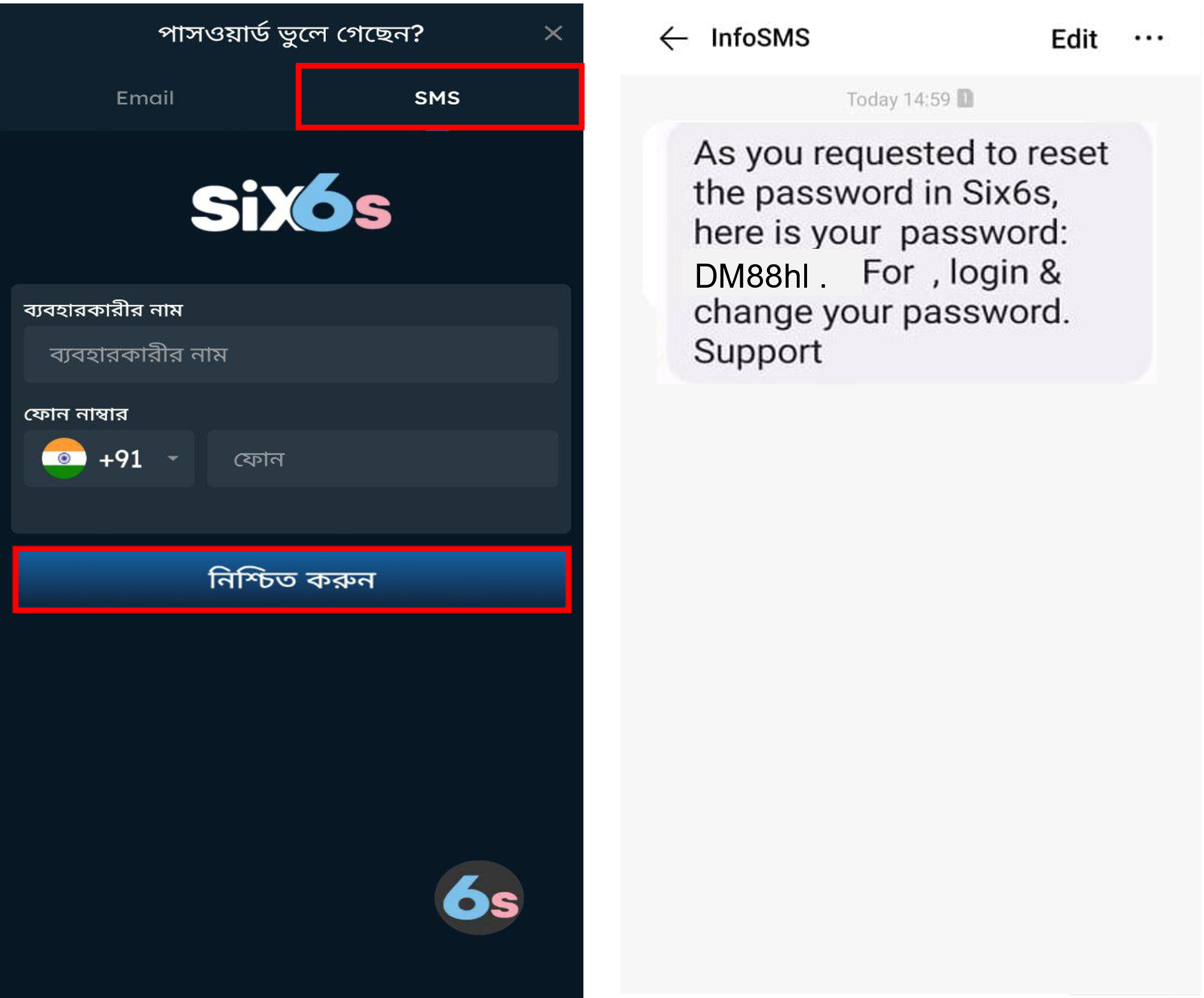 ii) আপনি যদি ফোন নাম্বের এর  মাধ্যমে পাসওয়ার্ড রিসেট করতে চান তবে আপনার Six6s অ্যাকাউন্ট এর ইউজার নেম এবং রেজিস্টার কৃত ভেরিফাইড ফোন নম্বর টি বসান এবং “কনফার্ম” এ ক্লিক করুন। এর সাথে সাথে আপনি একটি নোটিফিকেশন পাবেন যে আপনার পাসওয়ার্ডটি পরিবর্তিত হয়েছে এবং আপনার ফোন এর ইনবক্স টি চেক করুন। এবং আপনার রেনডম পাসওয়ার্ডটি রিসিভ করেছেন কিনা চেক করুন।