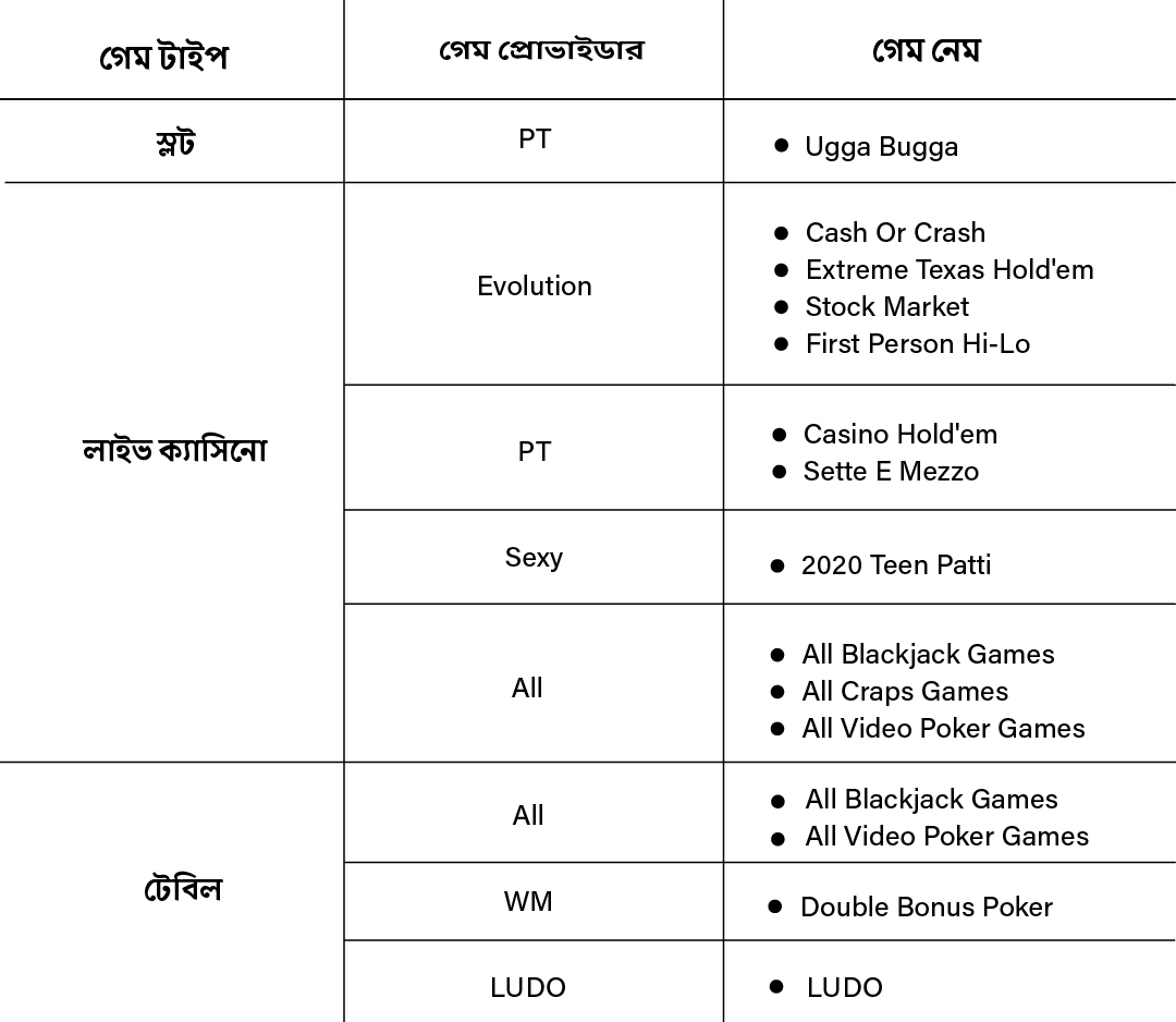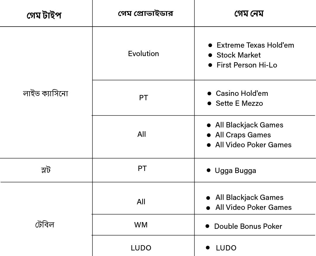 যদিও আমাদের প্ল্যাটফর্মের বেশিরভাগ বেটগুলি ভিআইপি (VIP) পয়েন্ট অর্জনের দিকে গণনা করা হয়, তবে এই নিয়মের ব্যতিক্রম রয়েছে। ভিআইপি (VIP) পয়েন্ট অর্জন থেকে বাদ দেওয়া গেমগুলির বিশদ বিবরণের জন্য, দয়া করে নীচের টেবিলটি দেখুন: