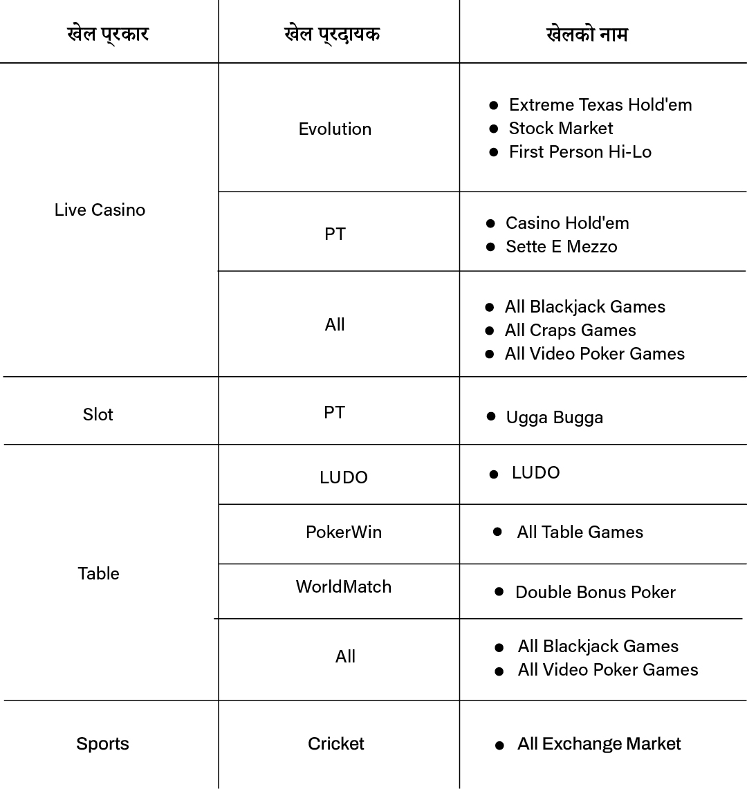 हाम्रो प्लेटफर्ममा राखिएका धेरैजसो बेट्सहरू कारोबार गणनामा गणना गर्न सकिन्छ, र हामीले प्रस्ताव गर्ने बोनसहरू खेलहरूको विस्तृत दायरामा प्रयोग गर्न सकिन्छ, त्यहाँ केही अपवादहरू छन्। बोनस शर्त र कारोबार गणनाहरू बाट बहिष्कृत खेलहरू र खेल बजारहरूको बारेमा विस्तृत जानकारीको लागि, कृपया तलको तालिकालाई सन्दर्भ गर्नुहोस्: