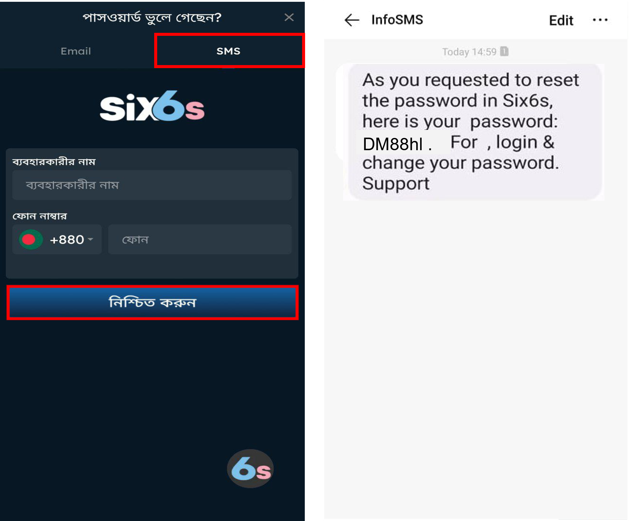 ii) আপনি যদি ফোন নাম্বের এর  মাধ্যমে পাসওয়ার্ড রিসেট করতে চান তবে আপনার Six6s অ্যাকাউন্ট এর ইউজার নেম এবং রেজিস্টার কৃত ভেরিফাইড ফোন নম্বর টি বসান এবং “কনফার্ম” এ ক্লিক করুন। এর সাথে সাথে আপনি একটি নোটিফিকেশন পাবেন যে আপনার পাসওয়ার্ডটি পরিবর্তিত হয়েছে এবং আপনার ফোন এর ইনবক্স টি চেক করুন। এবং আপনার রেনডম পাসওয়ার্ডটি রিসিভ করেছেন কিনা চেক করুন।