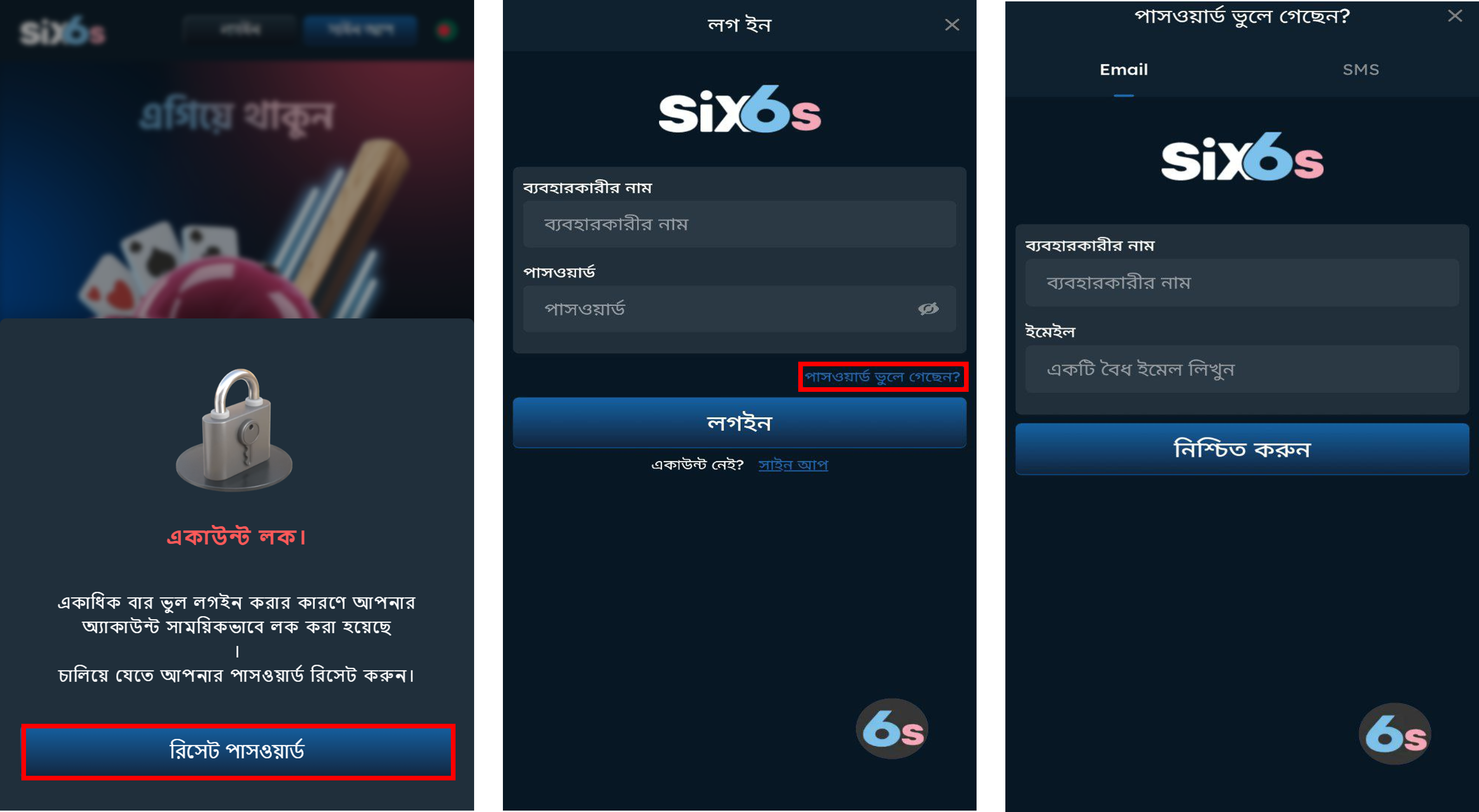 i) আপনি যদি ইমেইলের মাধ্যমে পাসওয়ার্ড রিসেট করতে চান তবে আপনার ইউজার নেম এবং Six6s অ্যাকাউন্ট এ রেজিস্টার কৃত ভেরিফাইড ইমেল অ্যাড্রেস টি বসান এবং “কনফার্ম” এ ক্লিক করুন। আপনার ইমেইল এ লগিন করুন এবং আপনার রেনডম পাসওয়ার্ডটি রিসিভ করেছেন কিনা চেক করুন যদি আপনার প্রাইমারির ইনবক্সে ইমেইলটি খুঁজে না পান তবে আপনার জাঙ্ক অথবা স্প্যাম ফোল্ডারটি চেক করুন।