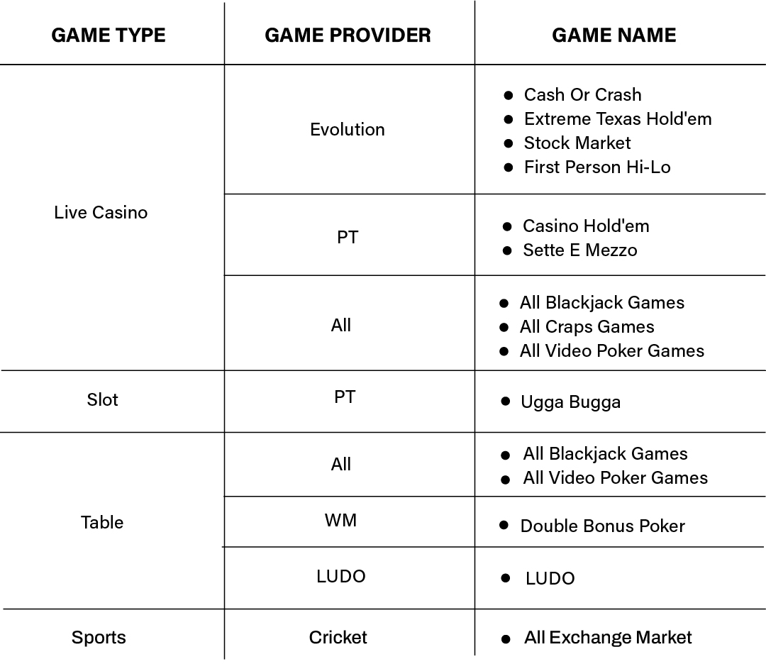 While most bets placed on our platform can be counted towards turnover calculation, and the bonuses we offer can be used on a wide range of games, there are some exceptions. For detailed information about the games and sport markets excluded from bonus wagering and turnover calculations, please refer to the table below: